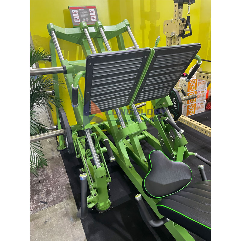 Разликата помеѓу нозете печатот иХак сквотиМашината е доста слична на онаа помеѓу нозете печатот и традиционалните сквотови. Во однос на опсегот на движење на сквотирање, сквотот со хакирање овозможува подлабок, поцелосен опсег во споредба со пресата на нозете. Во суштина, преса за нозе вклучува повеќе делумно движење, додека сквотот со хаки може да постигне целосен опсег.